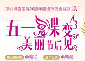 为回馈广大爱美人士,广东省深圳博爱医院将在五一期间开展大型优惠活动,CPT塑美极、BOTOX全面部提升等整形价格击穿底线,还有臻品玻尿酸相送,你能淡定吗?